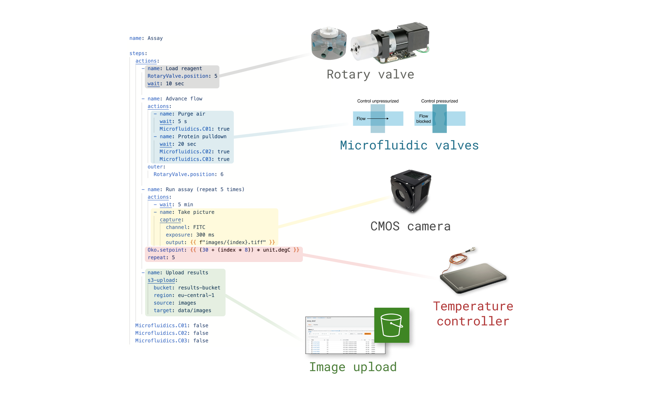 In this protocol we want to flow reagents onto a microfluidic chip by controlling both external rotary valves and on-chip microfluidic valves. Automancer makes it easy to integrate the different devices and control them via one protocol.