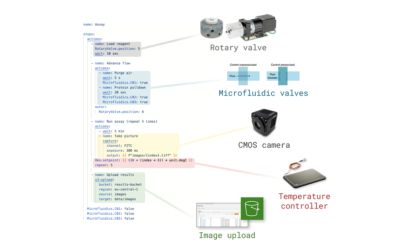 Note how achieving a similar result using a regular programming language would require a much larger amount of code, and be significantly less readable, as it would need to periodically check the temperature in a loop. Automancer abstracts away this logic to allow the scientist to focus on experiment design.