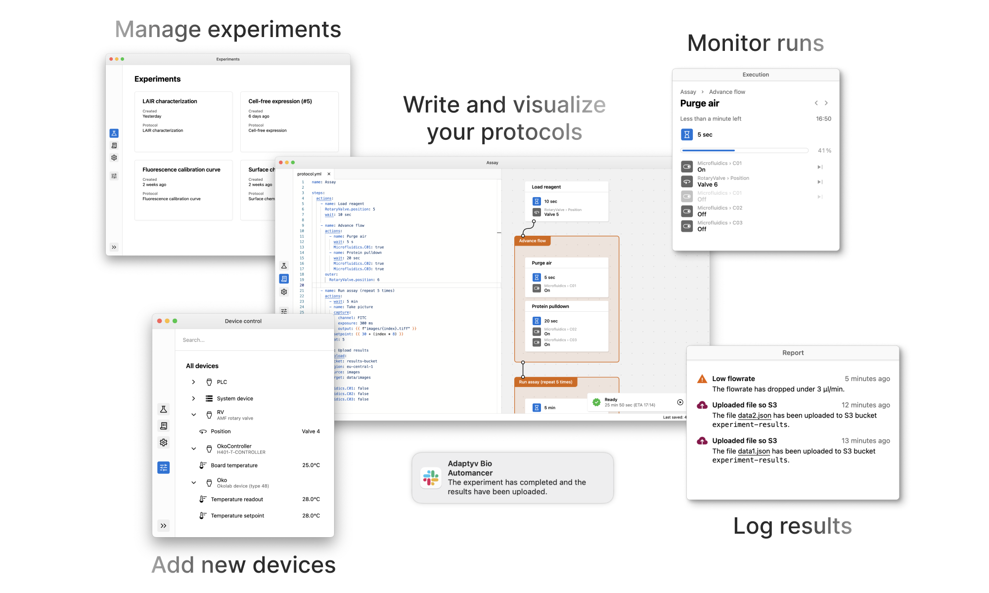 At Adaptyv Bio, Automancer allows us to explore more versions of experiments (i.e. protocol variants) either for assay development (searching for an assay configuration that works) or for process optimization (searching for what works best). It also helps us to limit human intervention and error, improve reproducibility, and run experiments out of office hours. Thanks to the text nature of protocols, we can store these in a Git repository to share them among members of the team and keep track of changes from one experiment to another. Development of Automancer was originally born out of a collaboration with the Maerkl Lab at EPFL and we would like to thank the lab for their support.