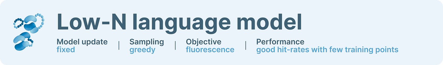 You might encounter the terms Bayesian Optimization and Active Learning as separate concepts while digging through the literature. Both fit into this model-based sampling category, the former being more common when tasked for optimizing a protein’s property, the latter for obtaining a more accurate fitness predictor or better training data.