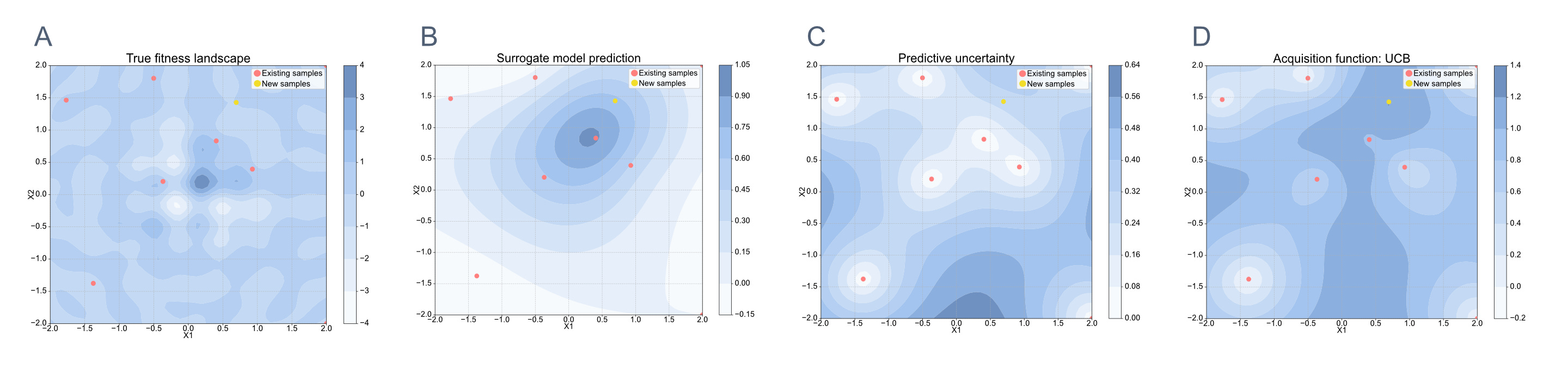 A) a simulated fitness landscape with input dimension (X1, X2) and a fitness dimension (color), with the previously sampled points shown in red and newly acquired points in yellow.