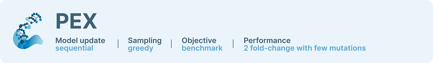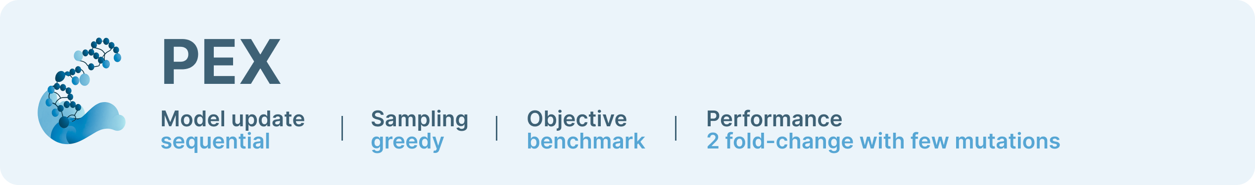 Next, PEX adapted this idea to focus more on local search. The acquisition function now includes an edit distance regularization term, controlled by a parameter λ, which penalizes candidates with high edit distance from wild-type sequences. This algorithm also deviates from the greedy selection approach. It instead selects candidates along the “proximal frontier”, defined as all maximal points at various λ. With this, PEX optimization yielded a great fitness improvement on an avGFP landscape. Maximum fitness (fluorescence intensity) was improved by 2-fold over the maximum value in the starting pool of sequences after 10 cycles with 100 sequences each, with a relatively lower mutation count (<10). On the same data, AdaLead reports a slightly worse performance (3.12 fitness score for PEX, 2.61 for AdaLead), with < 15 mutation count for the best performing variant as well. On an adeno-associated viruses VP1 protein dataset, AdaLead’s best variant had a mutation count of over 20 and a fitness score of 3.58, while PEX maintained it at below 5 and 4.45 score. The paper above offers an implementation of the PEX explorer.