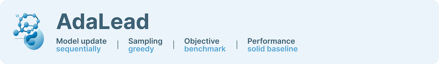 AdaLead is a greedy search optimization method, used in the literature as a robust benchmark. At each step, a model predicts fitness values for a selected batch of variants, with fixed parameter rates for recombination and mutation. The explore-exploit trade-off is not learned as the optimization proceeds. Instead, it is instilled a priori via a parameter κ that controls the fitness threshold for selecting new variants (within 1 − κ of the maximum fitness observed previously).