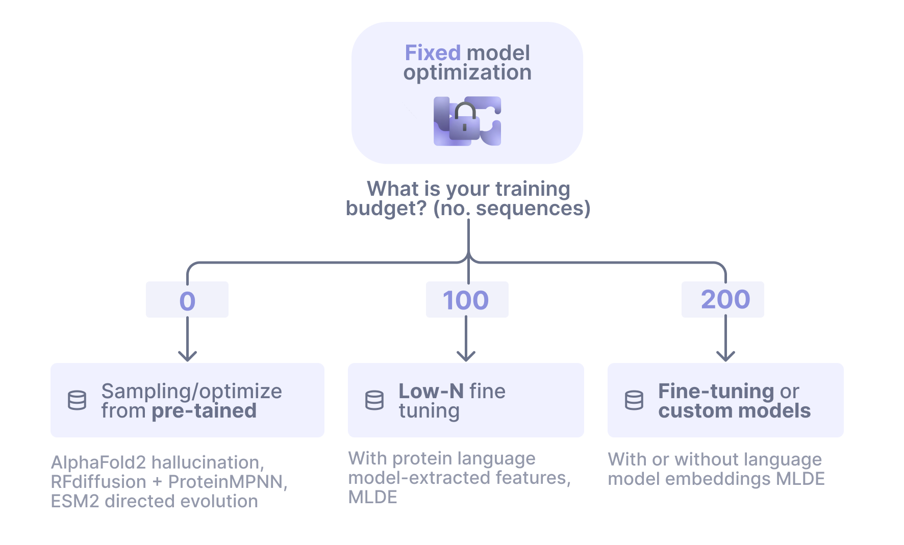 Fixed model approaches typically employ a, well, fixed pre-trained model. This can be a surrogate to map out the fitness landscape on in silico generated mutants or a generator conditionally sampling binders for a target. Training or fine tuning these models generally takes a lot more data than our assumed budget allows.